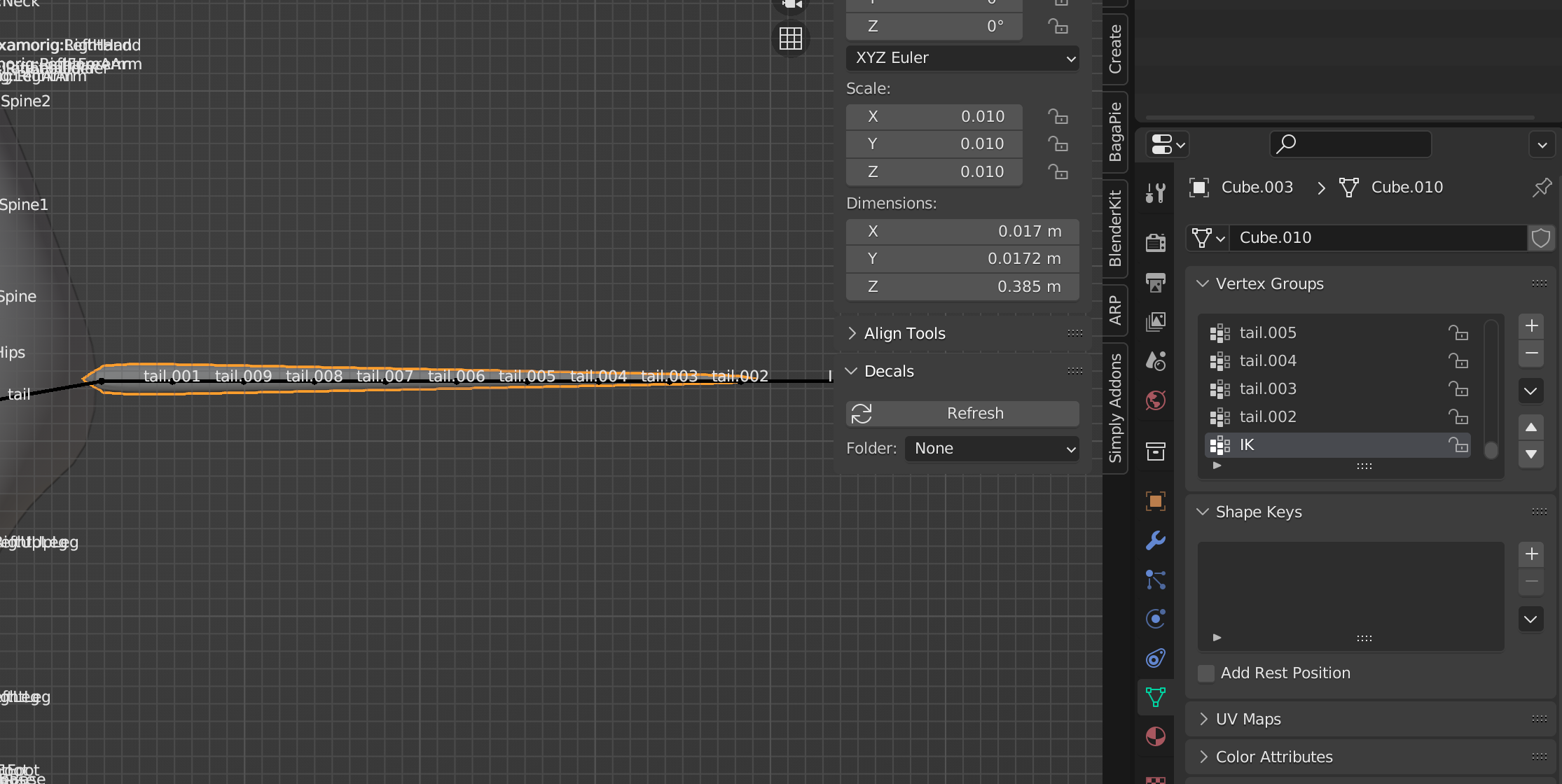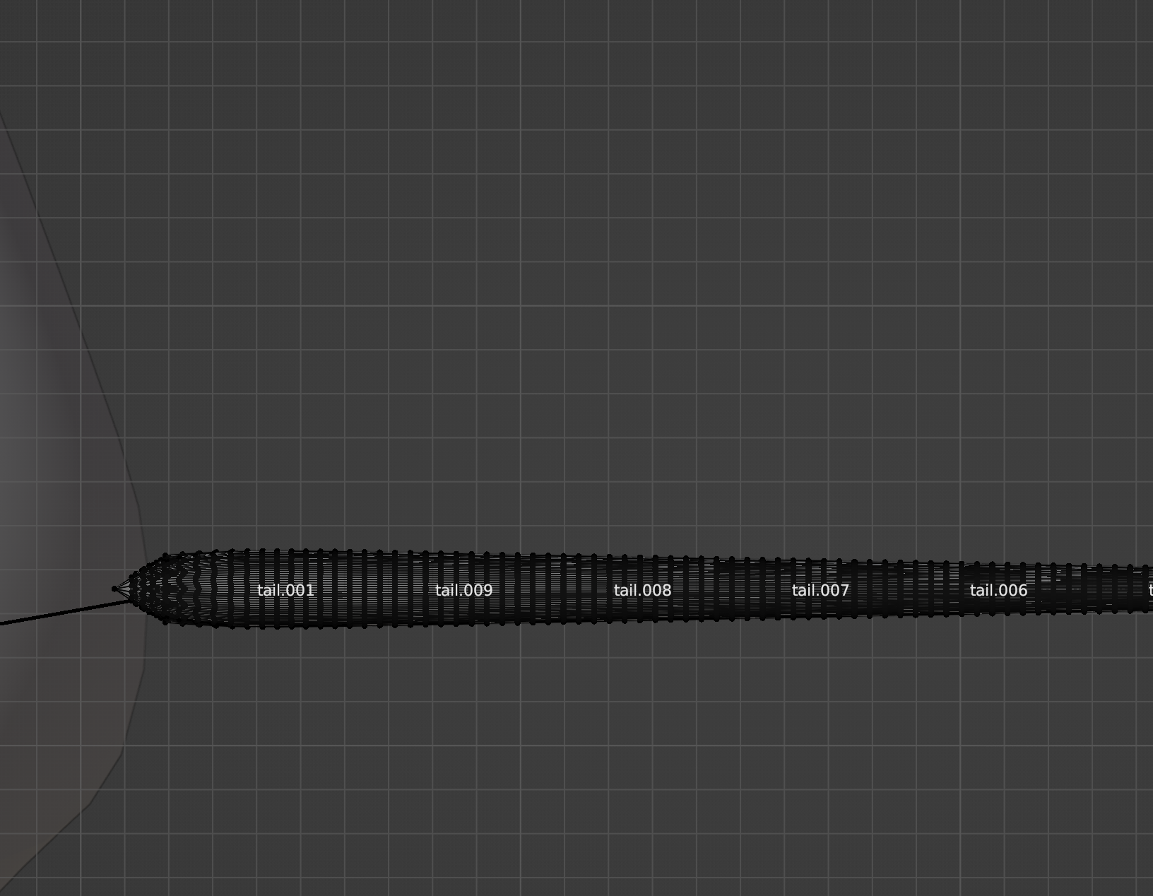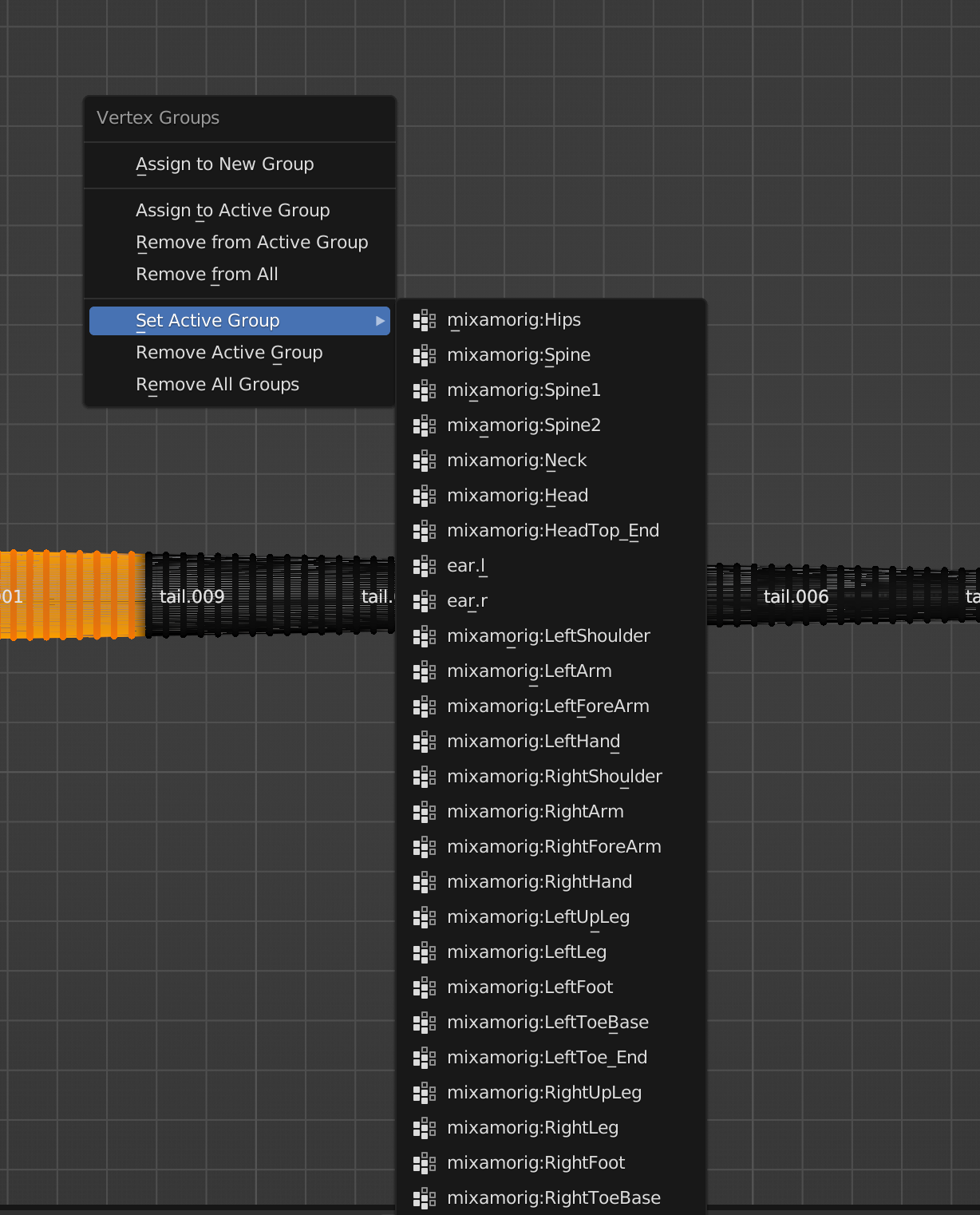 다음 뼈와 가까운 버텍스들을 선택하고, Ctrl+G를 눌러 해당 버텍스 그룹(위 이미지에서는 tail.009그룹)에 지정해주고, H를 눌러 숨긴다.