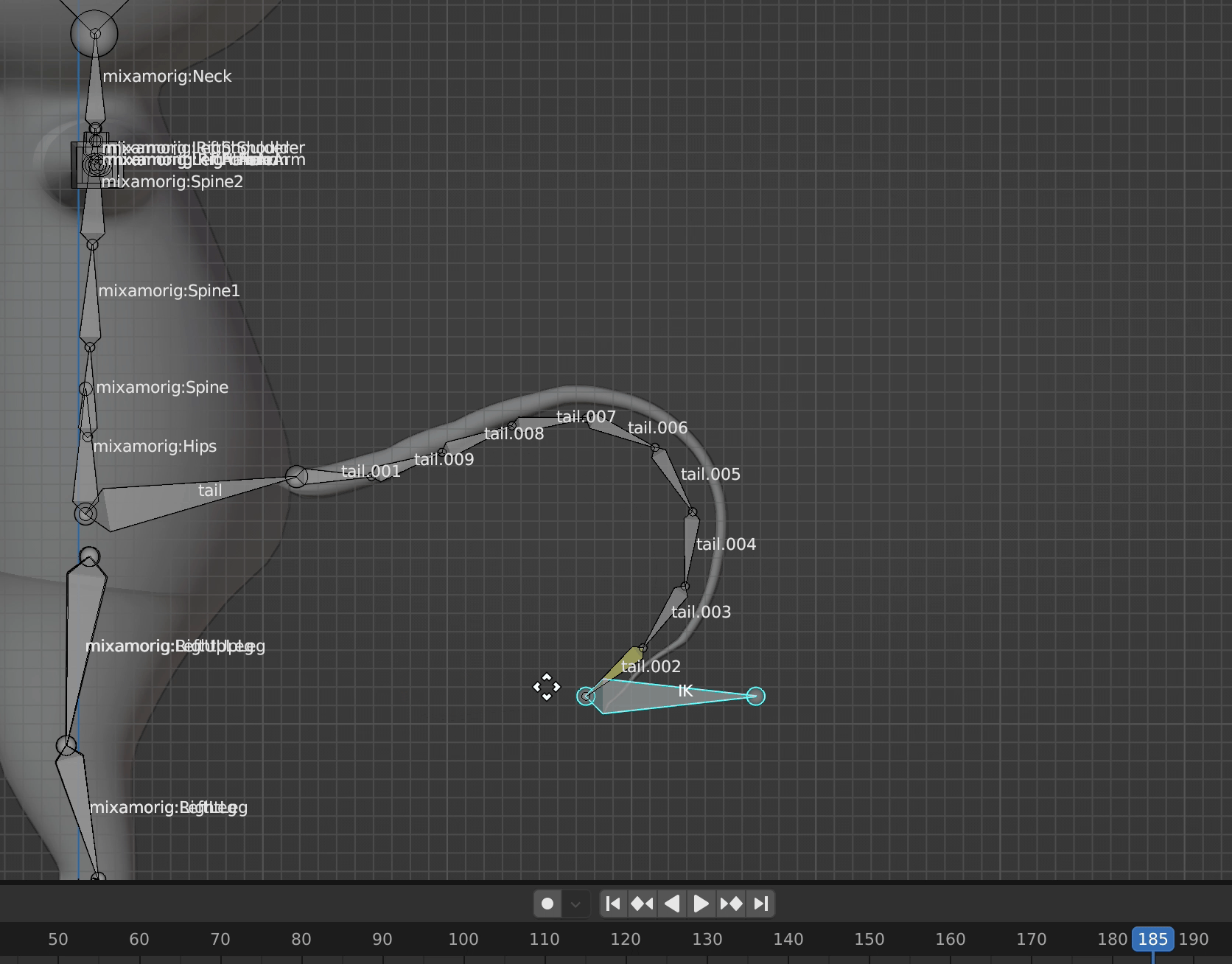 버텍스 그룹을 모두 지정한 뒤, armature을 누르고 Ctrl+tab을 눌러 pose mode에서 꼬리 IK 뼈를 움직여보면 꼬리 메쉬도 함께 따라오는 모습을 확인할 수 있다.