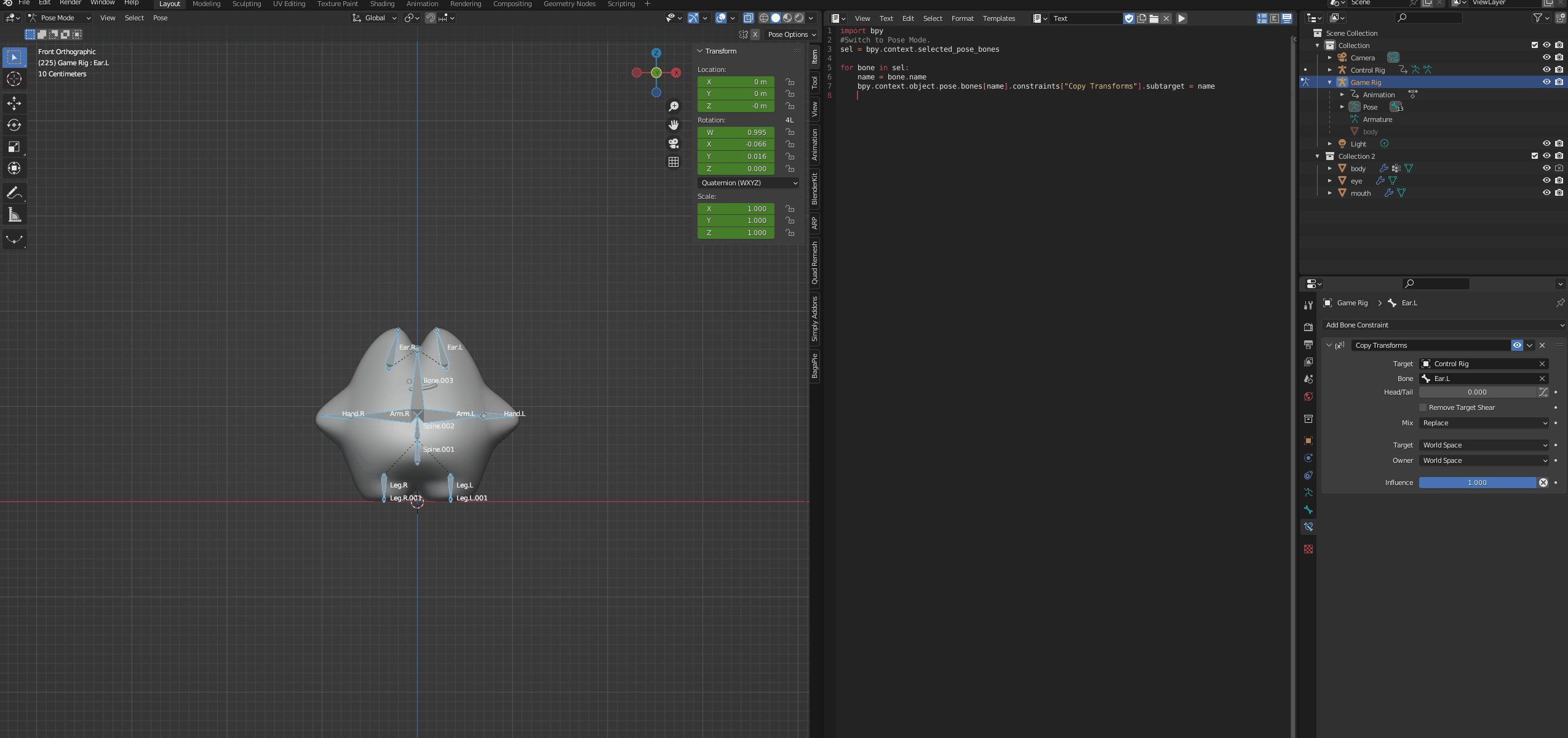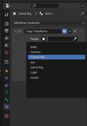 Game Rig 선택 후 Ctrl+Tab을 눌러 Pose 모드로 바꿔준다. 그리고 원하는 뼈를 선택한 뒤 우측 하단 Properties 패널에서 Bone Constraints 선택 > Copy Transform 을 누른다.