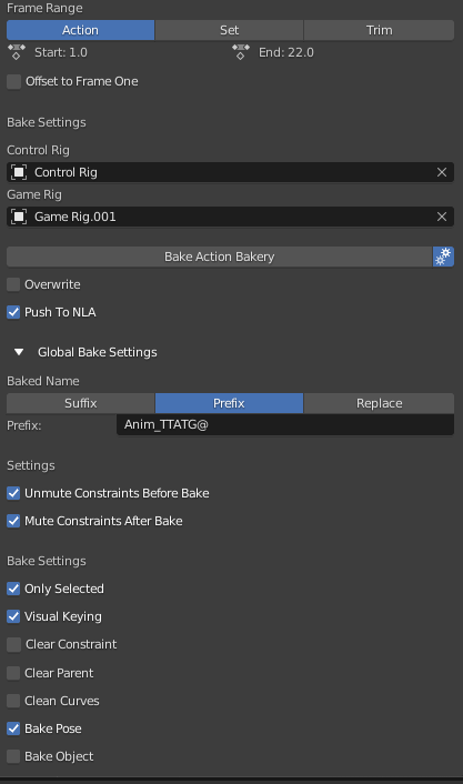 - Frame Range : 각 Action을 어느 프레임부터 어느 프레임까지 Bake할 것인지 결정해준다. Action으로 설정하면 Action 길이만큼 프레임마다 Action이 Bake된다.