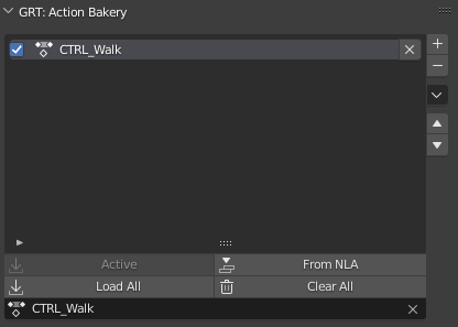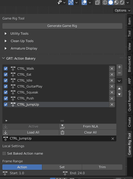Game Rig Tool이 NLA 를 변형할 수 있기 때문에 이런 식으로 Action을 내린 다음 Bake 목록에 추가해 베이크해볼 것이다.