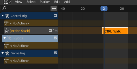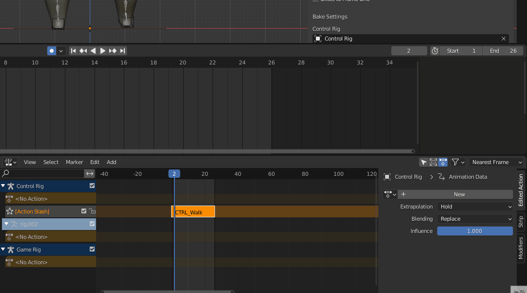 Action을 생성하고 나니 NLA 패널에 생성한 CTRL_WALK 액션이 생겨난 모습을 볼 수 있다.