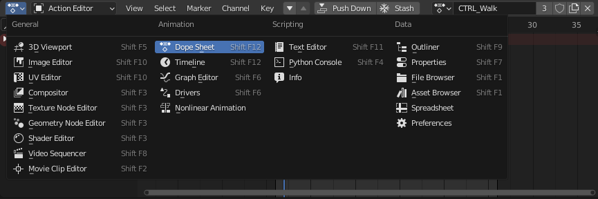 디폴트로 보이는 Blender Layout 패널에는 Timeline패널밖에 없기 때문에 여러 애니메이션 클립을 생성하기 위해서는 다른 패널을 추가해줘야한다. 패널을 Animation > Dope Sheet로 바꾸고 Dope Sheet를 Action Editor로 바꿔준다.