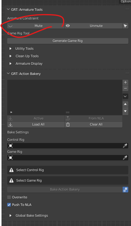 Game Rig를 선택한 후 Game Rig Tools 애드온 패널에서 Armature Constraint > Mute버튼을 눌러준다.