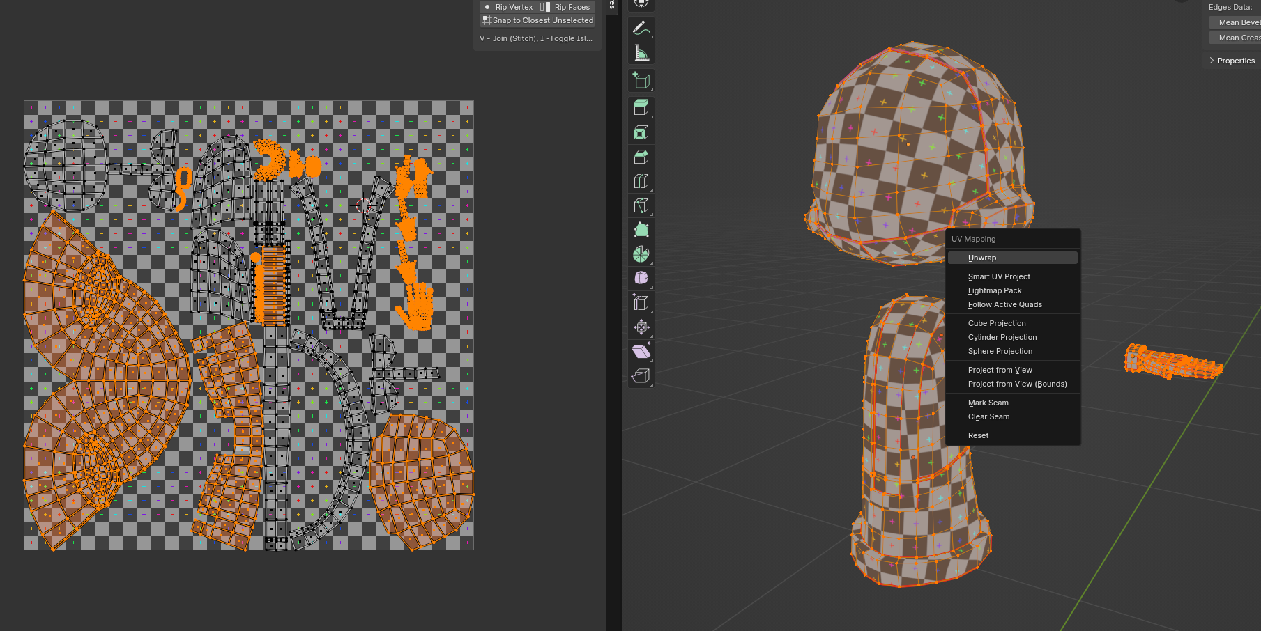 - Seam을 나눠준 오브젝트들을 선택하고 U>Unwrap을 선택해 줍니다.