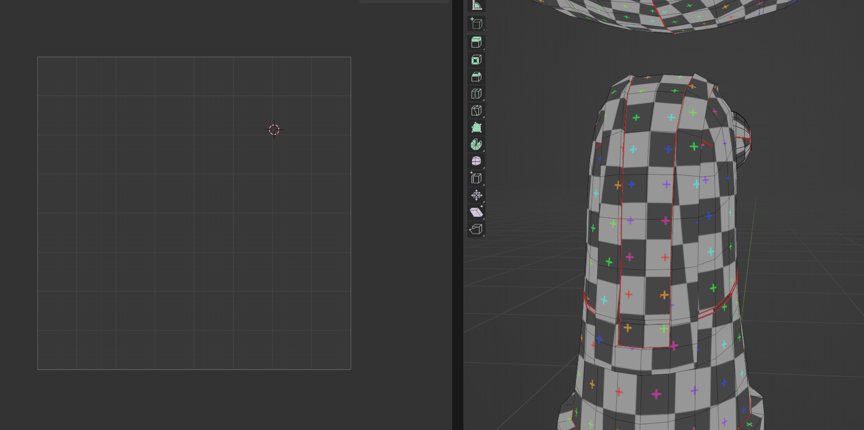 UV를 펼쳤을 때, 이런 식으로 직사각형으로 이뤄지지 않은 UV를 자주 볼 수 있는데요. 이런 경우 2번째 이미지처럼 텍스쳐가 세로로 일정하지 않고 기울어지게 됩니다. 일반적인 재질을 사용한다면 티가 나지 않을 수 있지만, 가로/세로 패턴이 들어간 텍스쳐를 사용할 경우 부자연스러워 지겠죠.