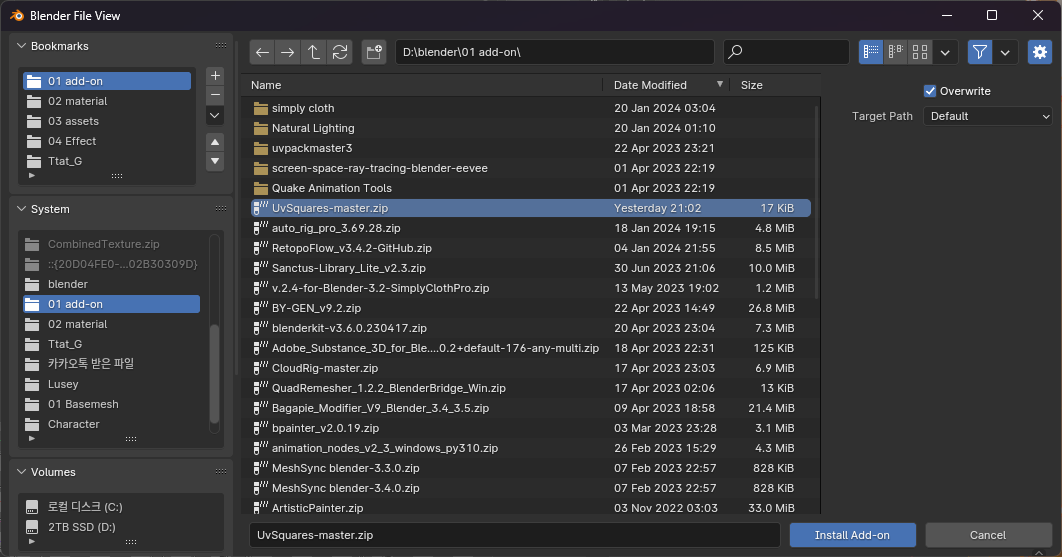- 다운로드 받은 경로를 선택하고, 파란색 버튼(Install Add-on)을 누릅니다.
