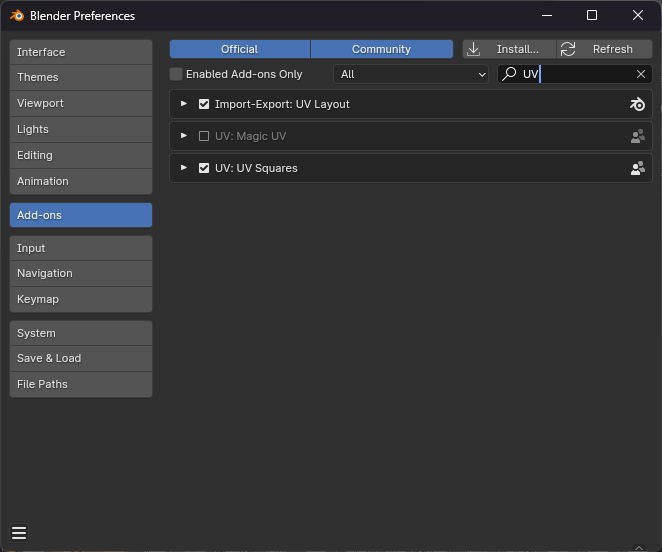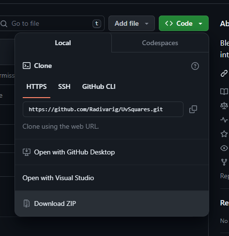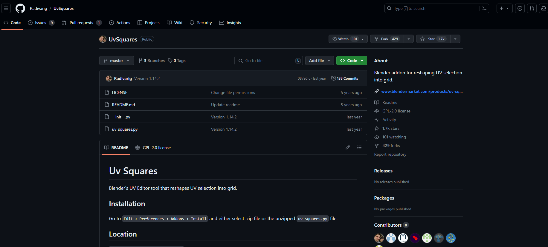 UV Squares는 유료 애드온으로, 블렌더마켓에서 유료구매하거나 GitHub에서 무료로 다운받을 수 있습니다. 저는 깃허브를 통해 무료 다운로드 받았지만, 유료로 구매할 경우 창작자에 대해 정당한 비용을 지불할 수 있고. 이후 버전에 대한 지원도 받으실 수 있으니, 유료 구매하시는 것도 추천 드립니다.