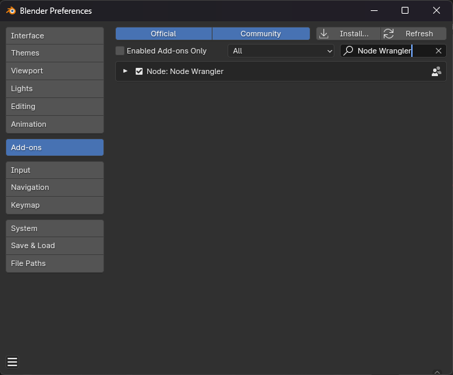- 좌측 가운데의 Add-ons 버튼을 누르고, 우측 상단의 검색창에 Node Wrangler를 입력합니다.