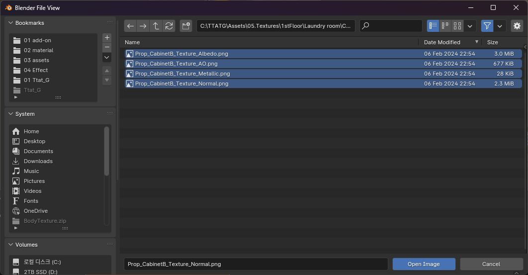 - 텍스쳐가 저장된 경로를 찾아서 모든 텍스쳐를 선택하고, Open Image 버튼을 클릭합니다.