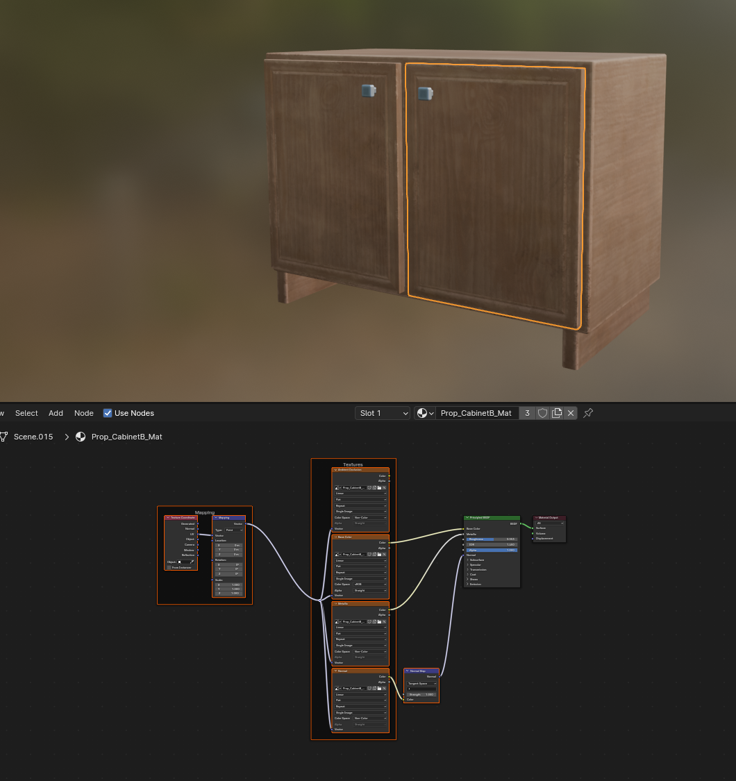 - 텍스쳐 맵이 자동으로 Principled BSDF에 연결된 모습을 확인할 수 있습니다.