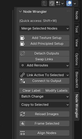 - 우측 하단에서 Node Wrangler 탭을 열어줍니다. (혹시 가려져서 안보이면 Shader 패널에서 N을 누르면 열립니다)