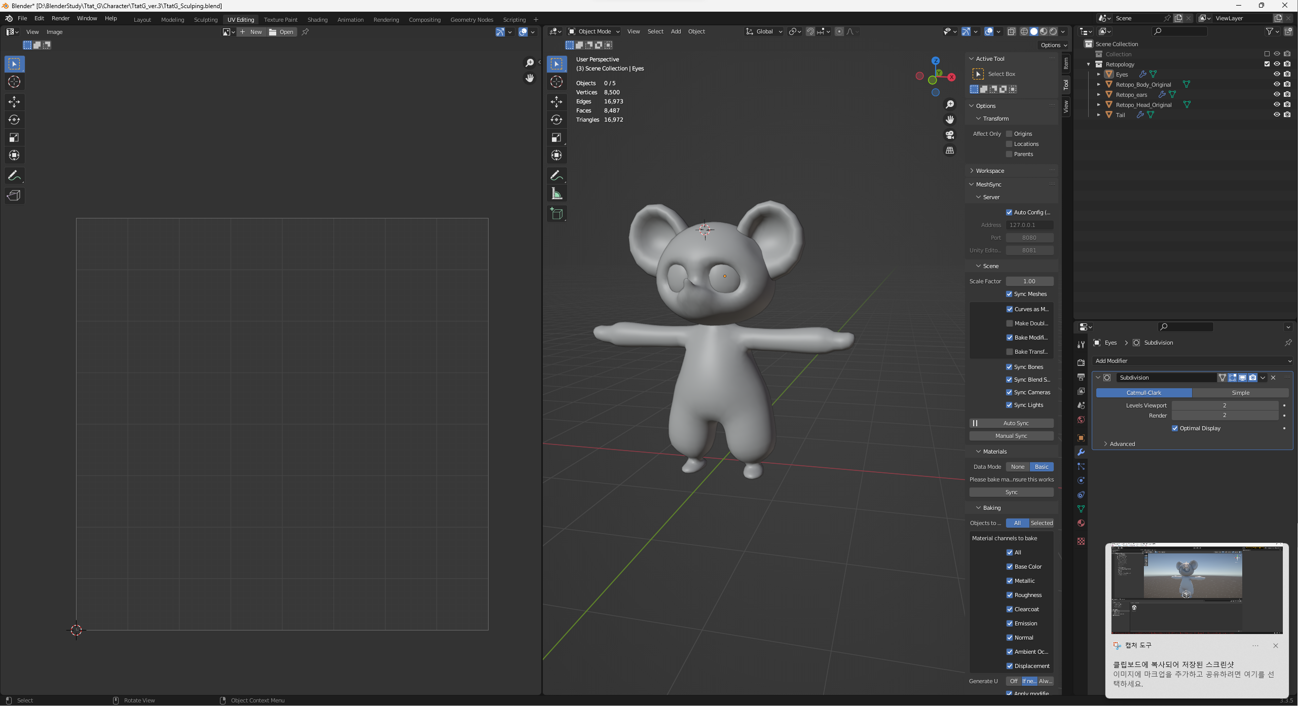 블렌더 3D Viewport 옆 패널 중 Tool을 보면 MeshSync가 생겨있다! 야호!